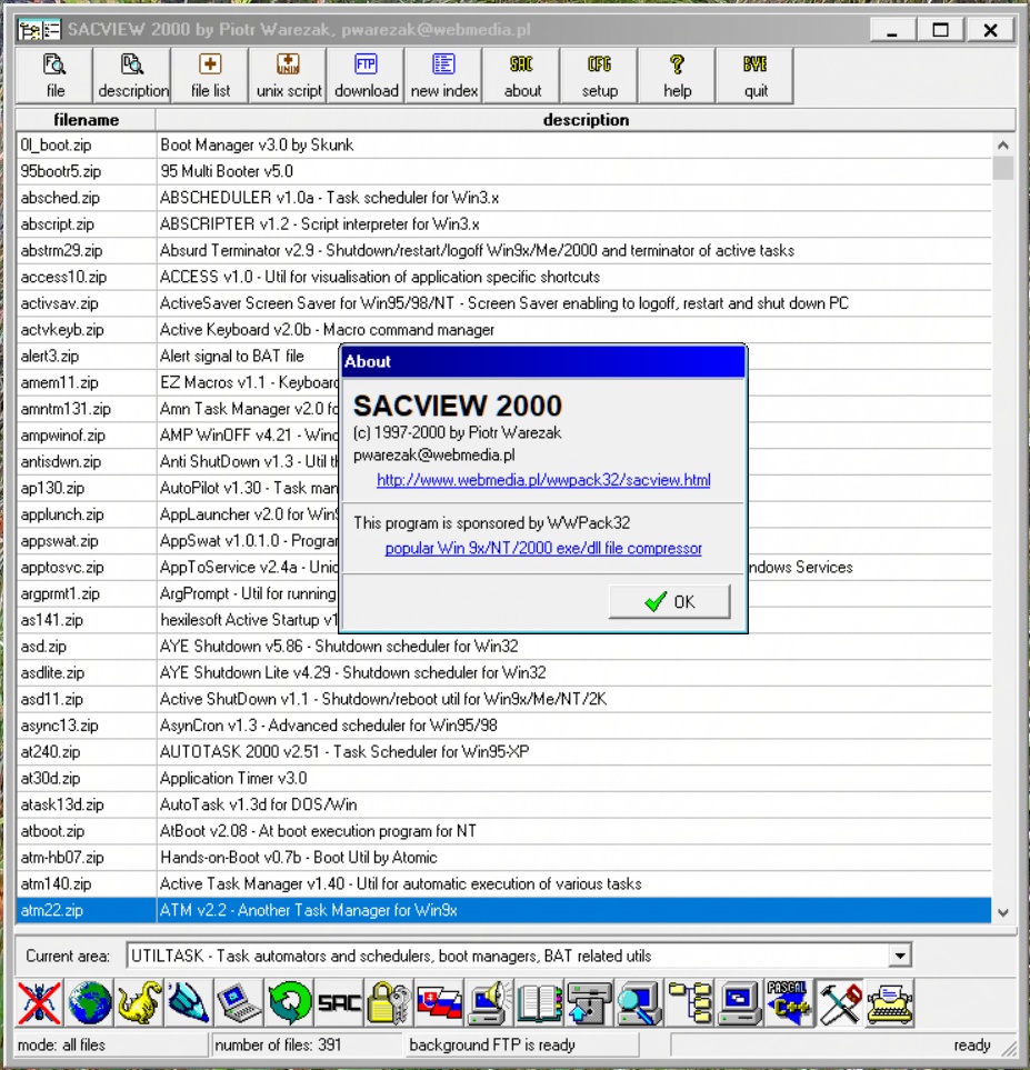 As You're Interested in Small Windows Programs: Here are some interesting links for you to explore. SAC (Slovak Antivirus Centre) Program Archive - HTTP & FTP An excellent source of early (1990s on) Windows / DOS freeware and shareware with around 19,000 programs grouped into 19 categories with an index file for each category included. The site is actively maintained by Peter Hubinsky ( peter.hubinsky@stuba.sk ). A lot of earlier and hard(er) to find programs, especially system utilities and AV/security related. The site also has an online and offline search feature - click here to see a screenshot of the offline search. The online site is here . . . https://www.sac.sk/ The HTTP mirror of the FTP site is here . . . http://ftp.elf.stuba.sk/pub/pc/ Dubber's Freeware Links page: Has 2,385 links to old freeware websites listed (on 1 page) - seems to have been last updated ~2006. I've explored a few links and there are some real gems to be found - plus some classic sites now long gone. Some of the sites listed are still up but for most it's the Wayback Machine (where DLs are a bit hit'n'miss, but it's better than a poke in the eye with a blunt stick). Link: https://dubber6.tripod.com/whereisit/id18.html I've also created a .pdf document of the page with clickable links . . . click here to download. Fat Bill's Freeware Links page: Links to around 900 w95-98+ freeware program sites - links only, no downloads. Nicely organised in major and minor category lists. The link below is from 2005. Link: https://web.archive.org/web/20050303222321/http://www.freewebs.com/fatbill/index.htm Ghacks 50 x 100kb or Less Windows Programs Links: An interesting page on Ghacks with a write-up on 50 small 100k or less Windows software programs, originally from 2010 and last updated 2016. Some of the classic small Windows programs are included - links only, no downloads. Link: https://www.ghacks.net/2010/02/20/50-100k-or-less-windows-software-programs/ I've also created a .pdf document of the page with clickable links . . . click here to download. |